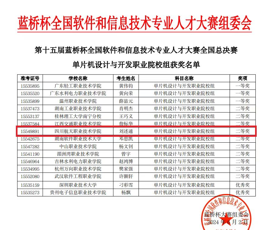 近日,备受瞩目的第十五届“蓝桥杯”全国软件和信息技术专业人才大赛--单片机设计与开发国赛圆满落幕。在激烈的角逐中,智能工程学院的学子刘述通凭借出色的技术实力和创新能力,荣获省赛一等奖、国赛二等奖,为学校赢得了荣誉。