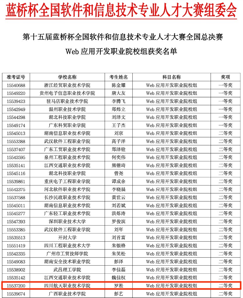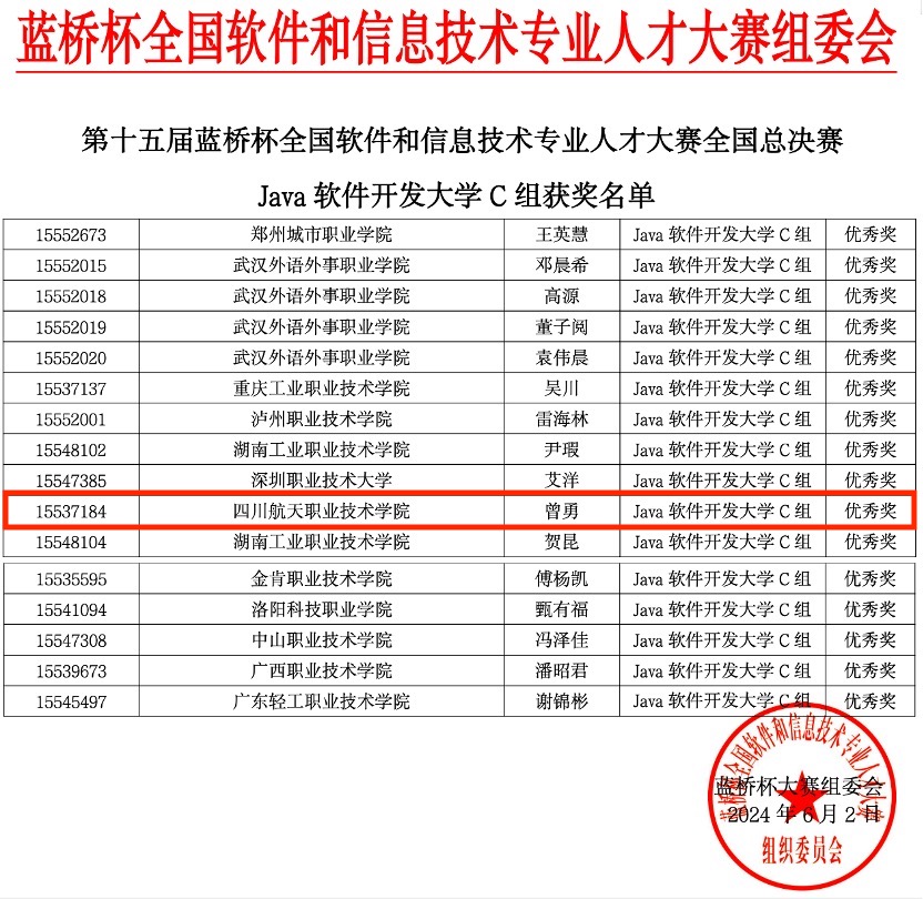 近日,第十五届“蓝桥杯”全国软件和信息技术专业人才大赛个人赛全国总决赛落下帷幕。全国千余所高校的25万大学生经过激烈的省赛角逐,脱引而出2万名省赛一等奖精英选手顶峰相见,展开精彩对决。来自计算机学院计算机应用技术专业学子罗淞荣获Web应用开发组全国二等奖,曾勇荣获Java应用开发组全国优秀奖。