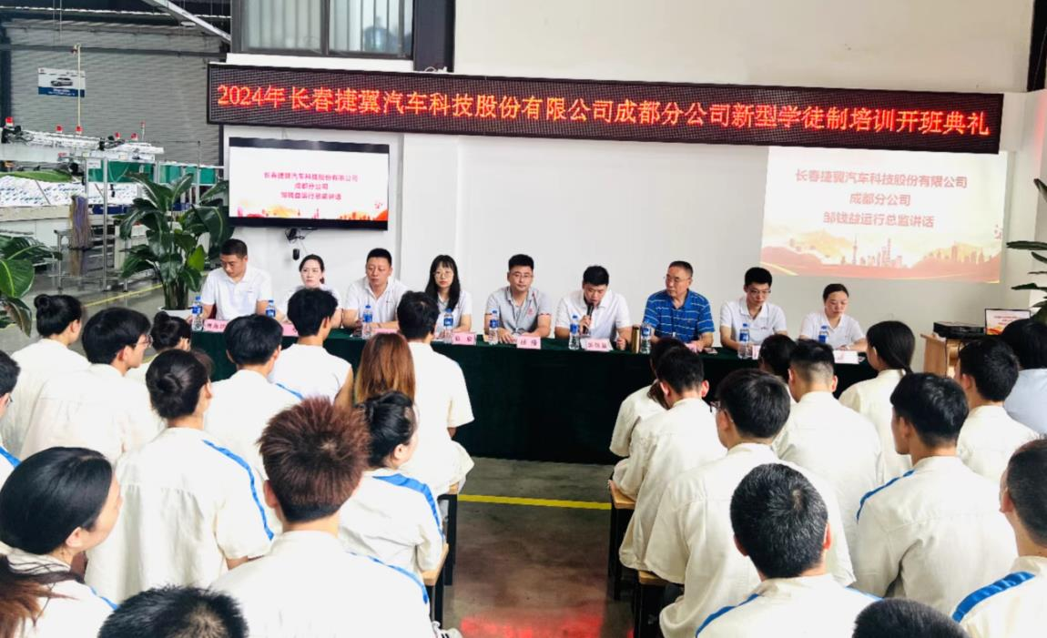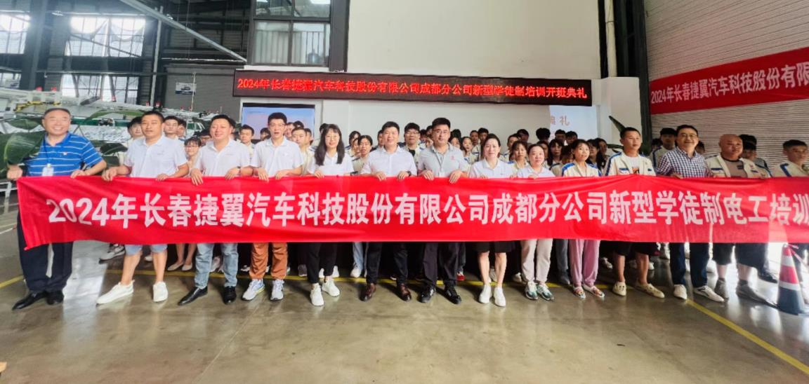 深化产教融合、创新人才培养模式。2024 年 7 月 23 日上午 8 点30 分,长春捷翼汽车科技股份有限公司成都分公司新型学徒制培训班开班典礼在公司一楼实训车间隆重举行。长春捷翼汽车科技股份有限公司成都分公司运行总监邹钱益、工业化总监张欣、运行经理朱远明、高级 HRBP 王艳、财务主管胡容、供应链经理倪朋、生产主管黄克建,四川航天职业技术学院继续教育部培训项目负责人杨格老师以及首期电工班 78 名培训学员共同参加了开班典礼。