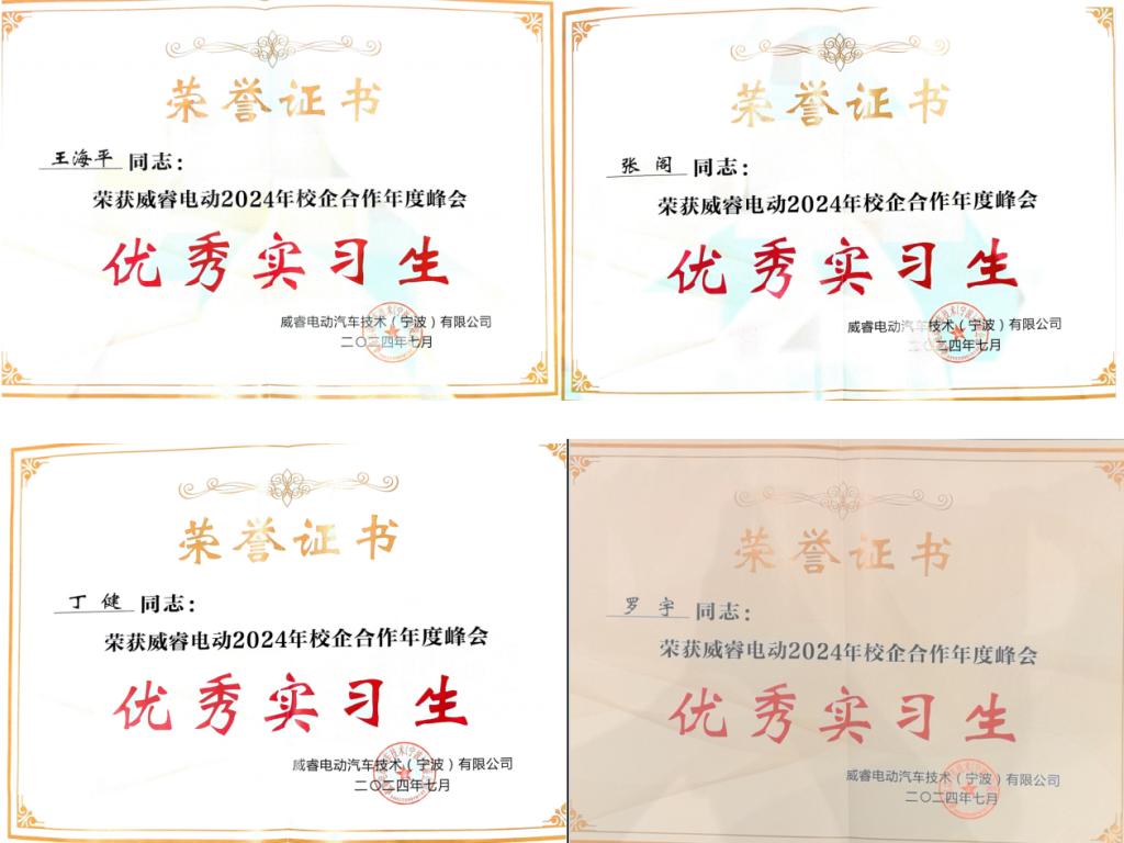 学校凭借在人才培养方面的卓越水平,获得了威睿电动2024年校企合作年度峰会“人才培养质量奖”称号,并获赠一台动力电池。此外,学校还有4名学生因在学业和实习中的出色表现,获得了威睿电动“优秀实习生”的表彰。
