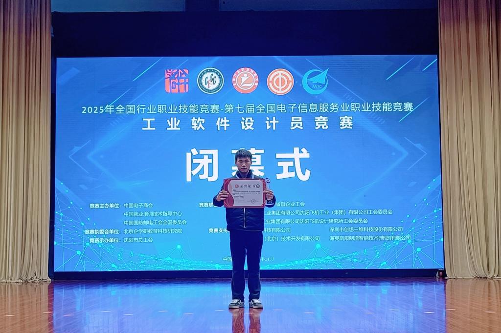 11月28日,第七届全国电子信息服务业职业技能竞赛—工业软件设计员赛项全国总决赛在沈阳圆满落幕。我校飞行器制造学院G24飞机电子设备维修3班的童嘉诚同学凭借出色表现,荣获高校学生组一等奖,学校获评“优秀组织单位”。此次获奖是我校在该类国家级竞赛中首次斩获一等奖,实现历史性突破。