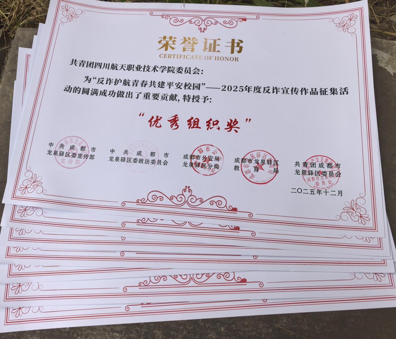 近日,由中共成都市龙泉驿区委宣传部、区教育局、共青团龙泉驿区委员会等部门联合主办的“反诈护航青春 共建平安校园”2025年度反诈宣传作品征集活动圆满收官,我校资助中心组织学生参与了此次活动。我校学子在此次活动中表现卓越,斩获多项荣誉,充分彰显了我校学生的创新思维、社会责任感和扎实的专业实践能力。