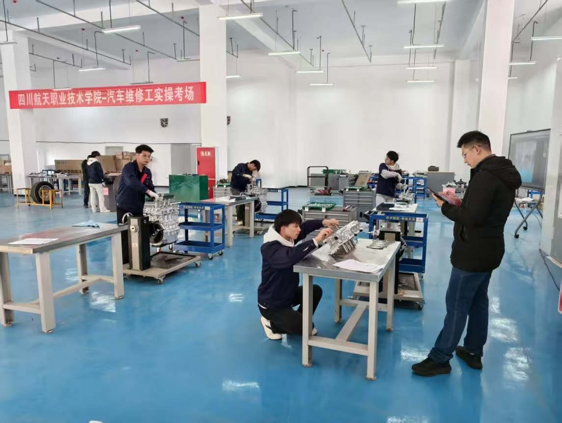为确保首次认定工作专业规范、严谨有序,学校高度重视、提前谋划。前期,由四川航天职业技术学院资深专家组成考评团队,联合学校专业教师召开专项考务会议,细化考试流程、严明考风考纪。同时,学校依托汽车运用与维修专业实训基地,严格按照国家认定标准,完成了理论考场和实操考场的标准化布置,配备了发动机拆装、汽车故障诊断等全套专业设备,并采用人脸识别系统进行考生身份核验,从人员、场地、技术到设备全方位保障认定工作的权威性与公正性。
