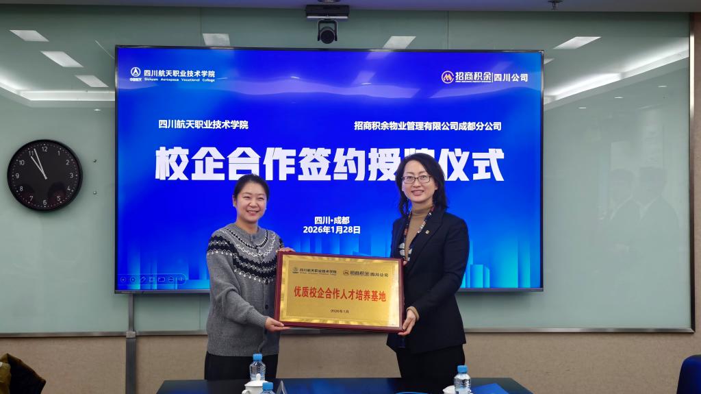 为深化产教融合,共育高素质技术技能人才,2026年1月28日,四川航天职业技术学院与招商积余四川公司订单班签约暨授牌仪式在中航城市广场顺利举行。我校就业处、人文与管理学院代表,与招商积余四川公司管理团队共同出席活动。