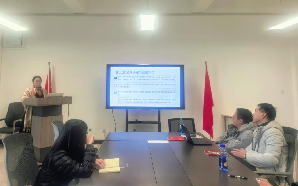 随后,李建群通过解读 3 项核心管理制度与 2 项监考员须知为主线,围绕期末工作全流程要求展开了培训。针对监考工作职责,结合机考与纸考两种场景,细化了监考人员在考前准备、考生证件核对、违纪作弊行为处置等方面的行为规范,着重强调监考人员必须严守工作底线,严禁出现监考期间闲聊、使用通讯工具等违规行为;关于阅卷与成绩管理,要求严格执行集体评阅、分题流水作业机制,规范成绩录入、核对及试卷保存流程;对期末各类资料的质量与归档进行了工作细化要求。此外,还解读了《教学事故认定和处理办法》,清晰界定一至三级教学事故的具体情形及对应处理标准,通过案例警示强化全体人员的纪律意识。培训现场设置答疑环节,针对参训人员提出的实操疑惑进行针对性解答,进一步压实工作责任。
