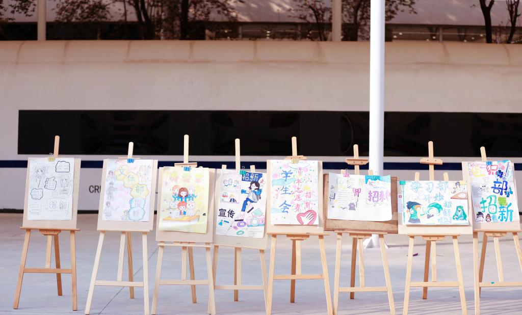 活动现场气氛热烈有序,各部门精心设计的招新海报整齐排列、创意十足,成为校园一道亮丽风景线。
