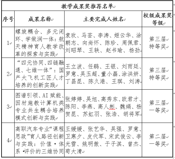 根据《四川省教育厅关于做好 2025 年四川省职业教育教学成果奖申报工作的通知》(川教函〔2025〕272 号)的精神,经团队申报、专家评审、学校校长办公会审议和学校党委会审定,结合文件精神和工作实际,我校拟推荐2025年四川省职业教育教学成果奖项目4项,由学校第二届校级教学成果奖一等奖1项和第三届校级教学成果奖特等奖2项、一等奖1项组成。同时,我校对4个项目的成果完成人在政治表现、师德师风、党风廉政、遵纪守法等方面进行审查,确认不存在影响其获评教学成果奖的情况。现将拟申报省级教学成果奖名单予以公示。