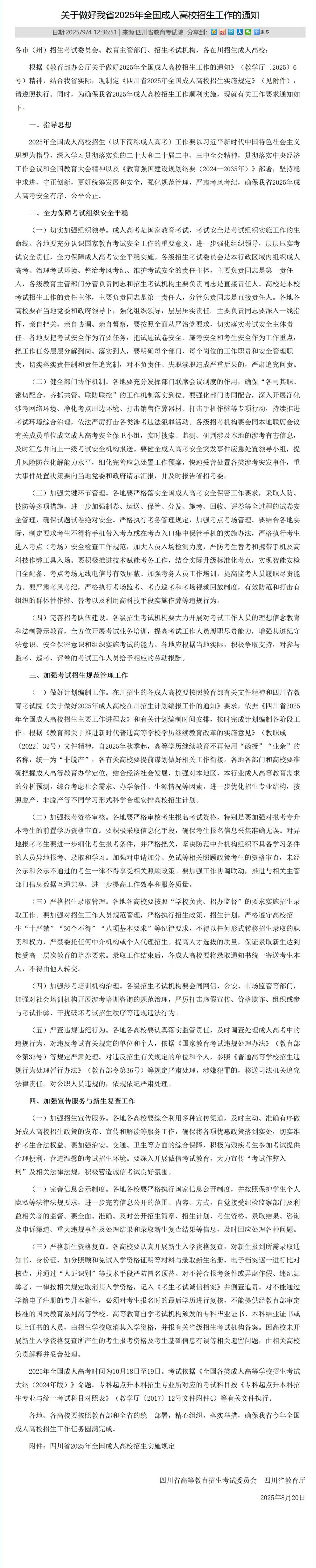 转载四川省教育考试院-关于做好我省2025年全国成人高校招生工作的通知