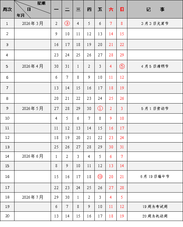 备注:寒暑假、节假日调休、考试安排以学校实际通知为准。